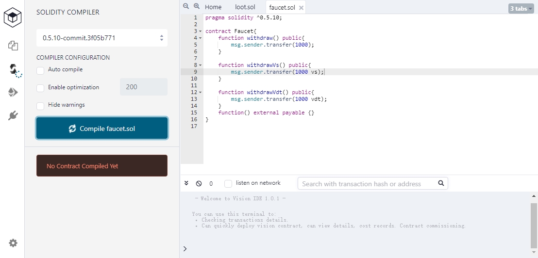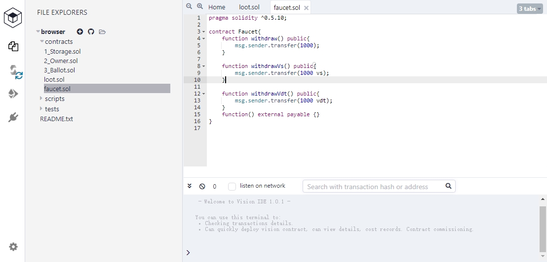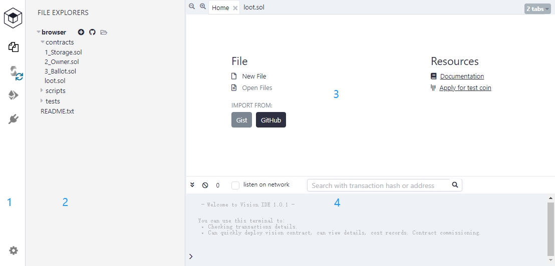 This article is used to introduce the usage of Vision-IDE, introduce the main page in the form of graphics, and complete the deployment of smart contract and function call.