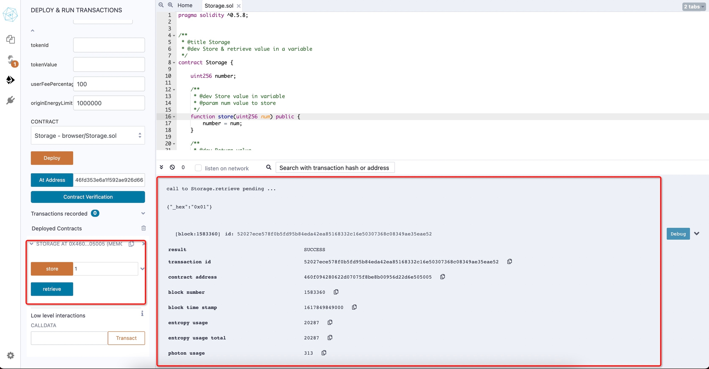 After successful compilation, use the deployment plugin (DEPLOYMENT). After successful deployment, the terminal will return transaction information.