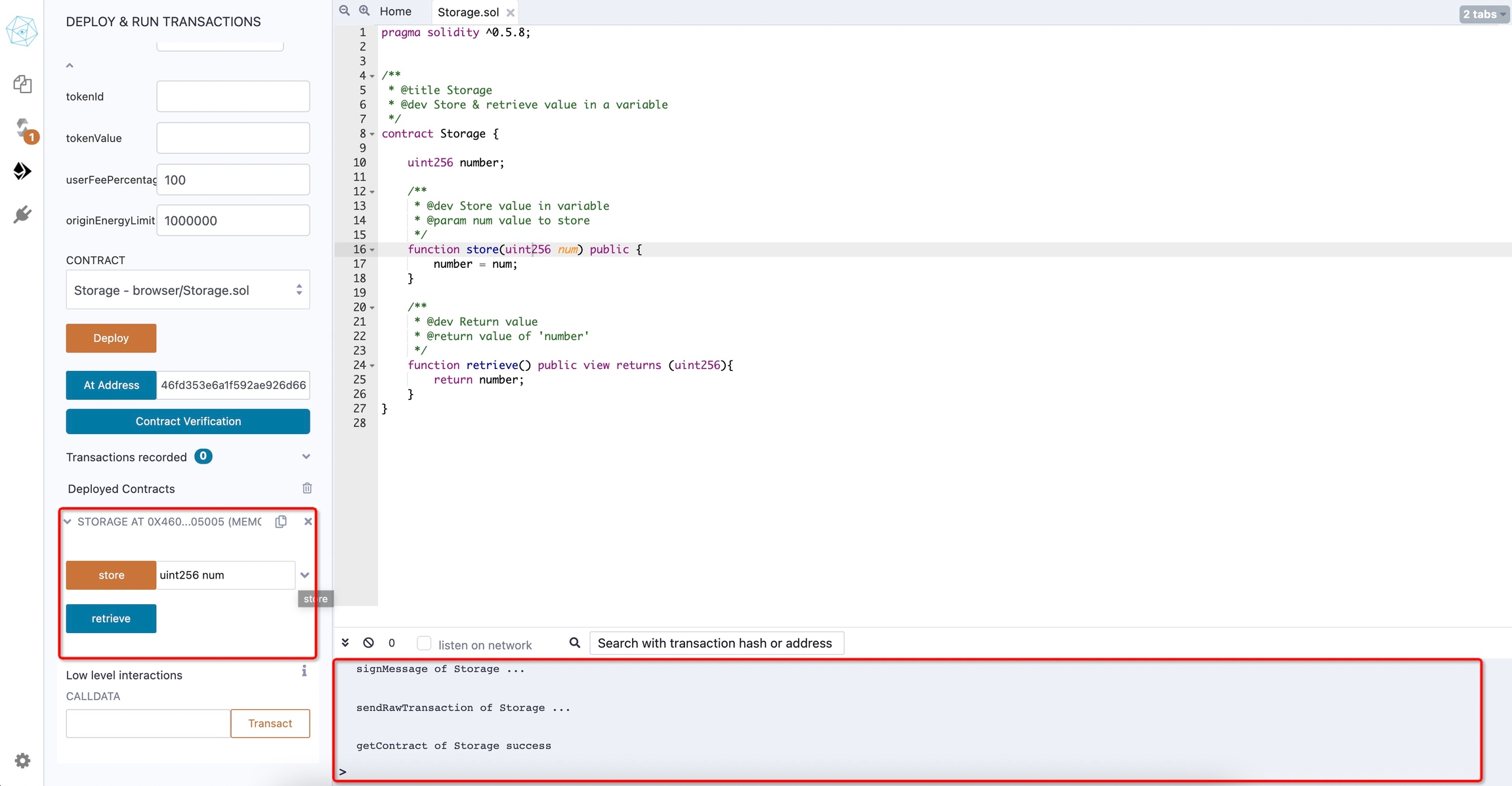 After successful deployment, the smart contract address is automatically loaded, and the function can be transfered in the drop-down menu; the existing smart contract address can also be loaded through the button 'At Address'.