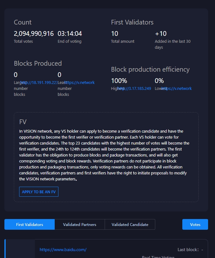 check all the FV & paranter & candidates, decide who you want to vote to earn rewards and contribute to Vision network. As a FV , you also can full fill details to campaign for votes. and manage your reward by generact block